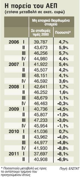 Το ΑΕΠ, όπως το… γνωρίζαμε σύμφωνα με τα στοιχεία που ανακοινώθηκαν προ τριμήνου, «βούτηξε» κατά 5,5% το α’ τρίμηνο του 2011. Ομως η τότε μέτρηση κρίθηκε από την ΕΛΣΤΑΤ ότι «δεν παρέχει ικανοποιητικά αποτελέσματα» και τώρα το επαναϋπολογίζει χωρίς να αναφέρεται πότε θα δοθούν νέα και αξιόπιστα στοιχεία.