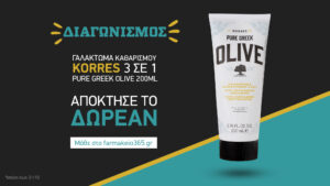 Συμμετάσχετε στον διαγωνισμό του farmakeio365.gr και κερδίστε εντελώς δωρεάν το καταπληκτικό γαλάκτωμα καθαρισμού από το Κορρέ, Korres Pure Greek Olive 200ml. Το μόνο που χρειάζεται να κάνετε για να δηλώσετε συμμετοχή στο διαγωνισμό του farmakeio365 είναι να εγγραφείτε στο newsletter της σελίδας, για αυτό μεταβείτε στην σελίδα από τον παρακάτω σύνδεσμο.