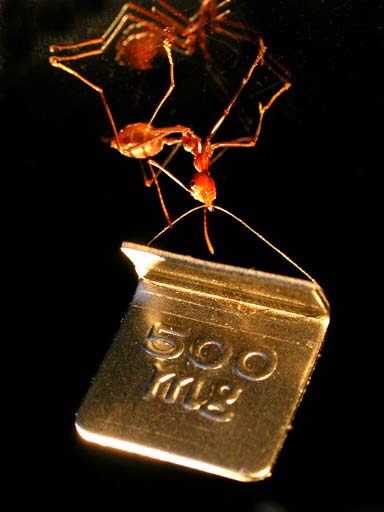 Από τη θεωρία στην πράξη πέρασε ένας ειδικός ζωολογίας του Πανεπιστημίου του Cambridge και κατάφερε να κάνει ένα μυρμήγκι να σηκώσει 100 φορές το βάρος του. Ο Δρ. Thomas Endlein απαθανάτισε τη στιγμή που ένα ασιατικό μυρμήγκι κάθεται ανάποδα σε μία γυάλινη επιφάνεια και κρατά βάρος 500 mg από τα σαγόνια του. Αποτέλεσμα; Κέρδισε το πρώτο βραβείο σε διαγωνισμό επιστημονικής φωτογραφίας, καθώς και 700 λίρες.